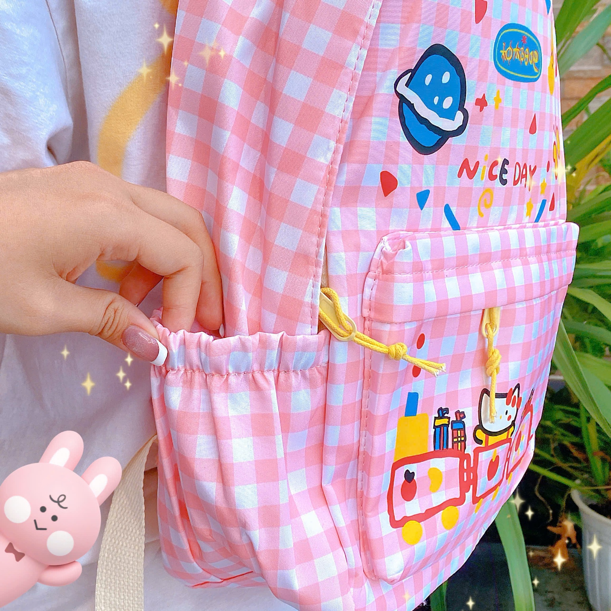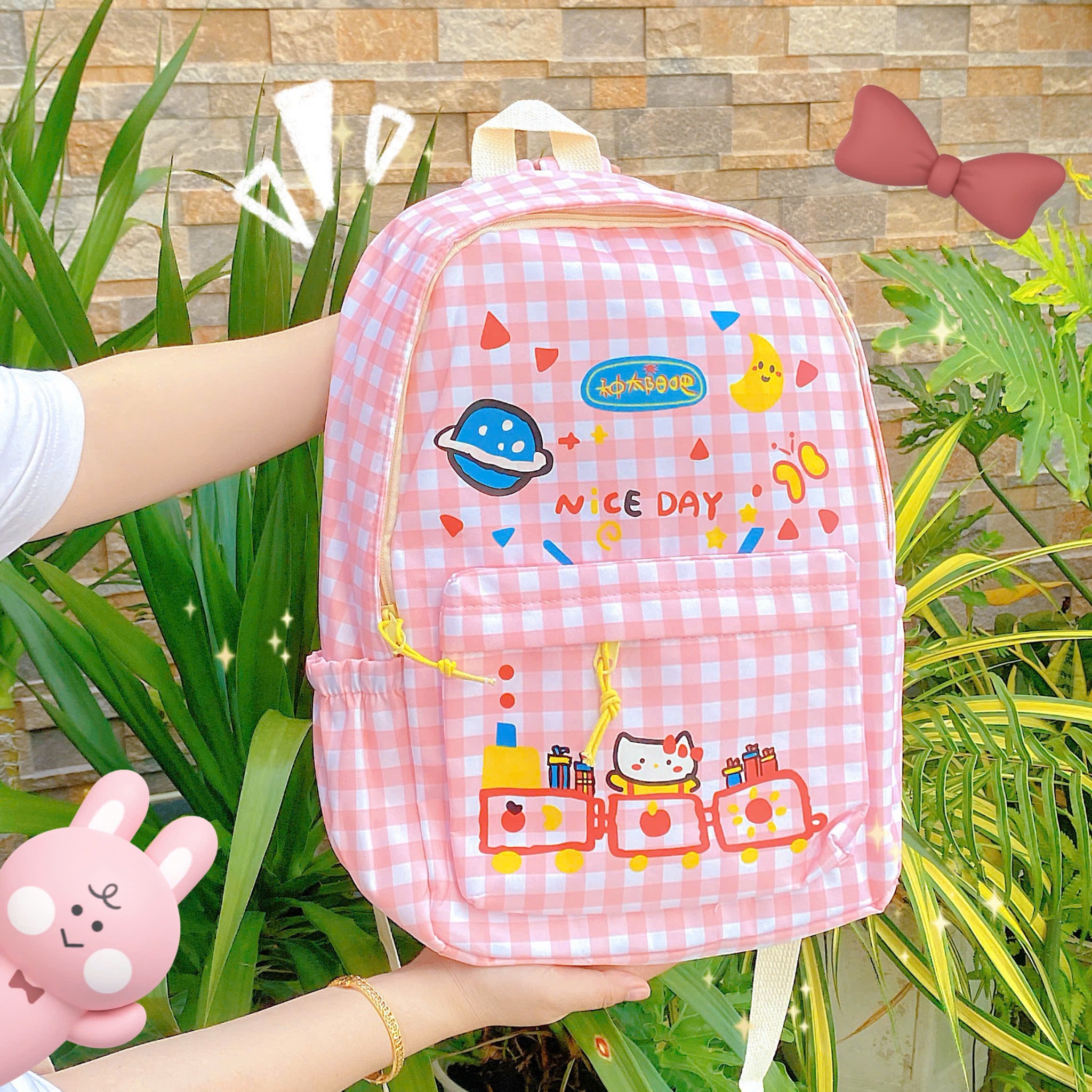 ** Balo Kitty sọc caro hồng trắng Nice Day