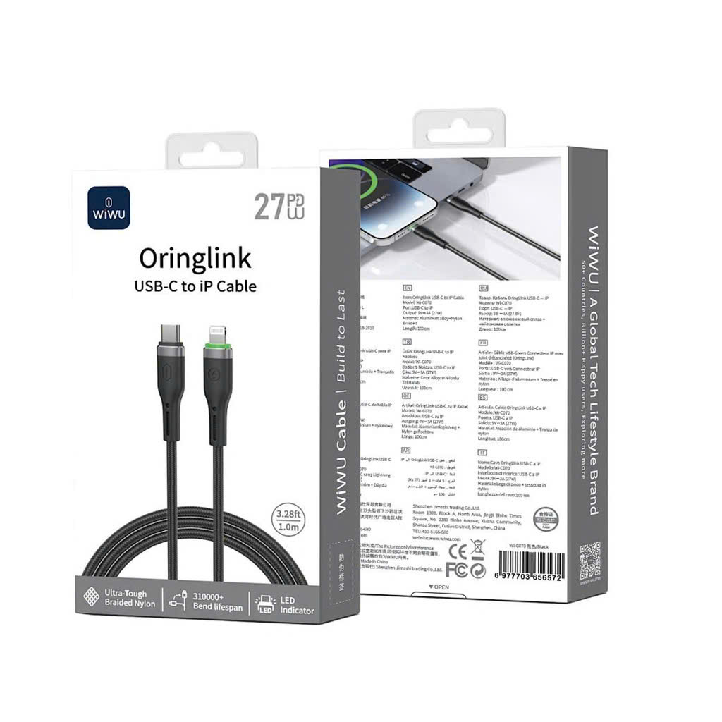 Cáp Type C to Lightning Wiwu Oring 27W 1m có đèn báo