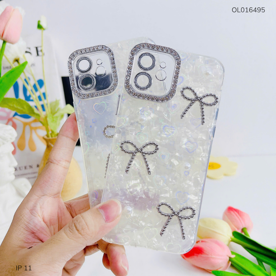 Ốp IP 11 6.1 lưng nhũ kim tuyến sticker nổi cún nơ hồng