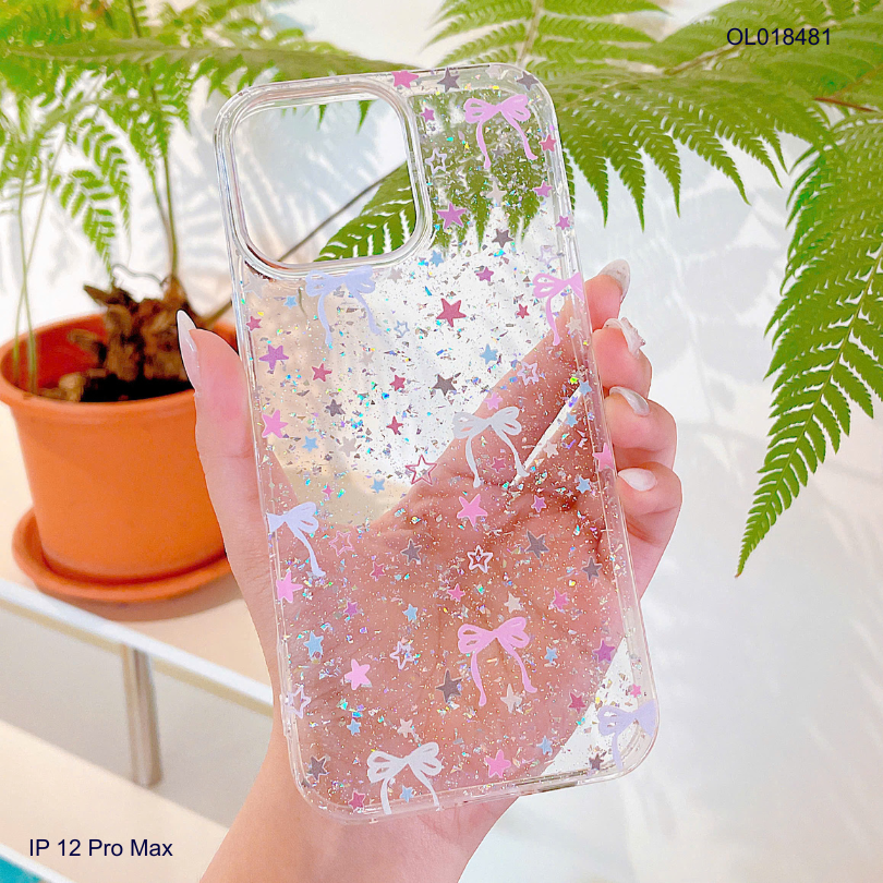 Ốp IP 12 Pro Max lưng trong cứng kim tuyến in ngôi sao và nơ