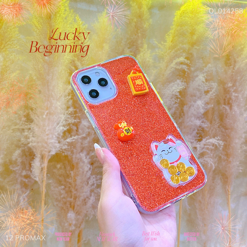 ** Ốp IP 12 Pro Max mèo thần tài lắc tiền và túi tiền đỏ