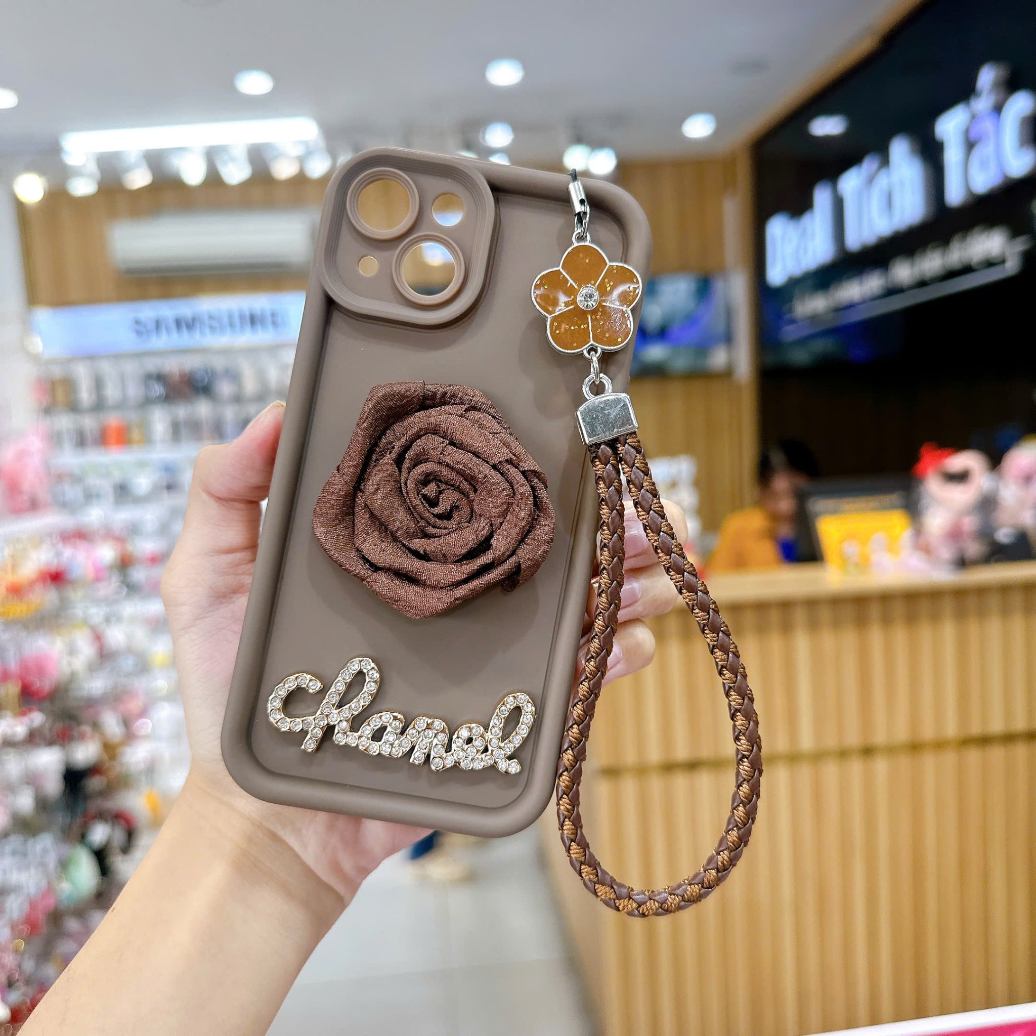 ** Ốp IP 13 6.1 dẻo nâu charm hoa hồng vải Chanel