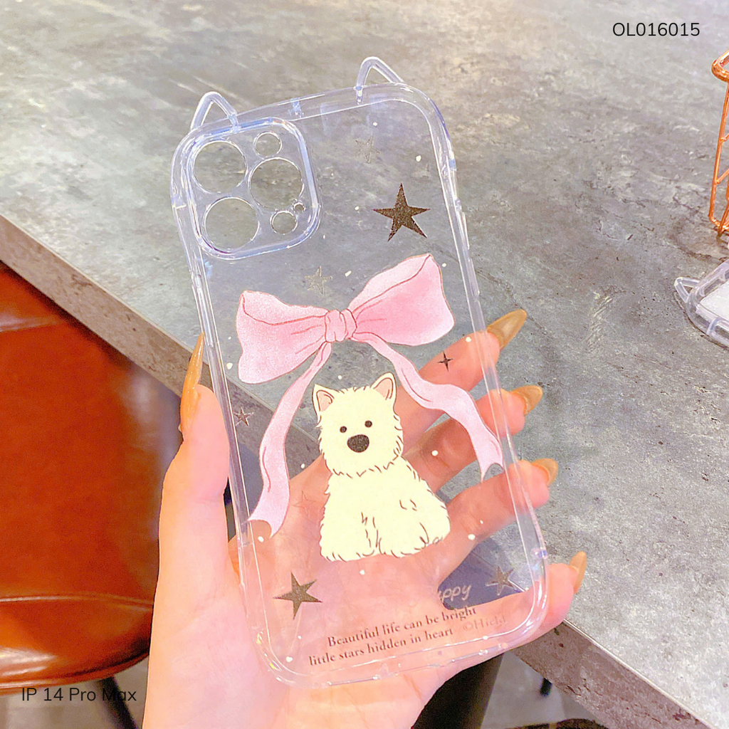 Ốp IP 14 Pro Max dẻo tai mèo cún trắng nơ hồng