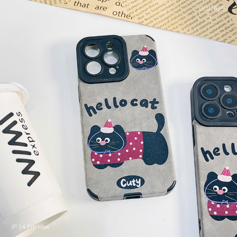 Ốp IP 14 Pro Max giả da mèo đen áo chấm bi tím cuty