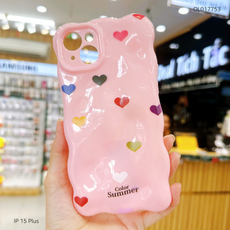 Ốp IP 15 Plus vân gồ ghề trái tim Color Summer kèm sticker tim