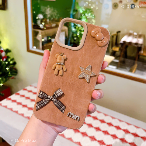 Ốp IP 15 Pro Max giả da lộn đính Gấu min nâu