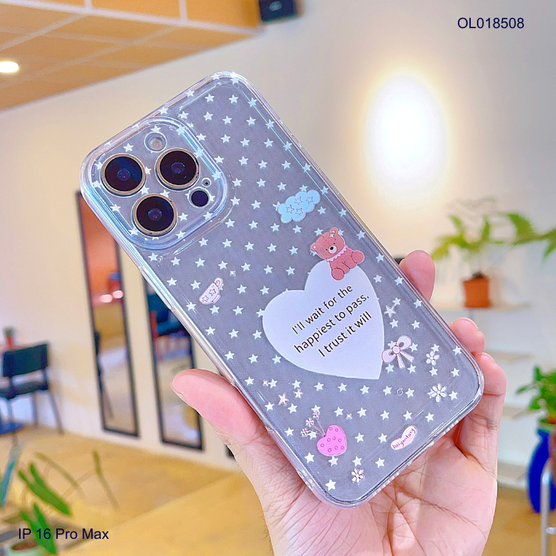 Ốp IP 16 Pro Max dẻo trong in tim lớn và gấu nâu