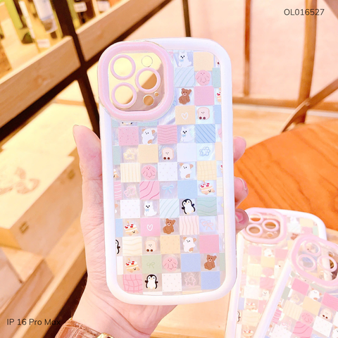 Ốp IP 16 Pro Max dẻo viền nổi nhiều thú kẻ ô vuông