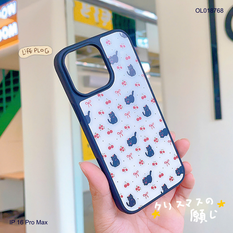 Ốp IP 16 Pro Max mèo đen và cherry nền trắng viền đen