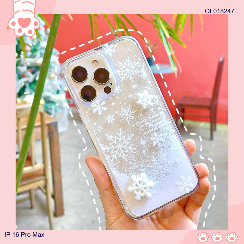 Ốp IP 16 Pro Max nhũ nước charm nổi bông tuyết trắng